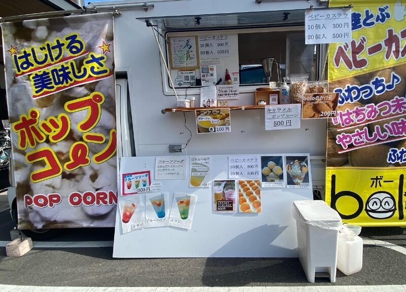 ベビーカステラ・ポップコーン・ドリンク各種あったかいスープにフランクフルトもあります。